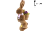 Deze paashaas is gemaakt van faitrade chocolade en zijn standaard afgemaakt met een strik en een goed gevulde paasmand op zijn rug.